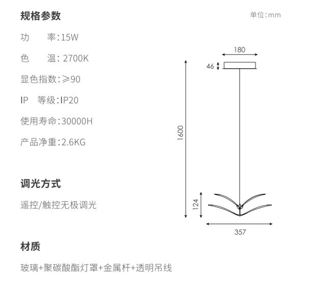 如翼吊灯用双层弯曲的造型作为主要造型特征形成在空间里自由灵动的造型,,以一定的角度倾斜,,形成丰富的画面,,,,两翼的线条均为精心设计,,精准控制光线的传播,,将直下光和漫反射光结合,,70%灯光向下,,,30%灯光向上,,在空间里形成舒适的光学效果,,,下灯罩为片状玻璃印刷专门调制的乳白色油墨,,,热弯成对应弧度,,,,灯光透过灯罩呈现出更加柔和的视觉效果;边缘特意留有5mm宽度透明环,,使视觉更精致轻巧;灯罩利用两个金属“领夹”式的杆连接固定,,整体视觉优雅;