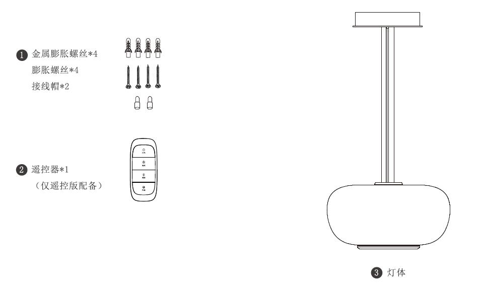 金属膨胀螺丝*4;膨胀螺丝*4;接线帽*2 遥控器*1(遥控版本);灯体*1;